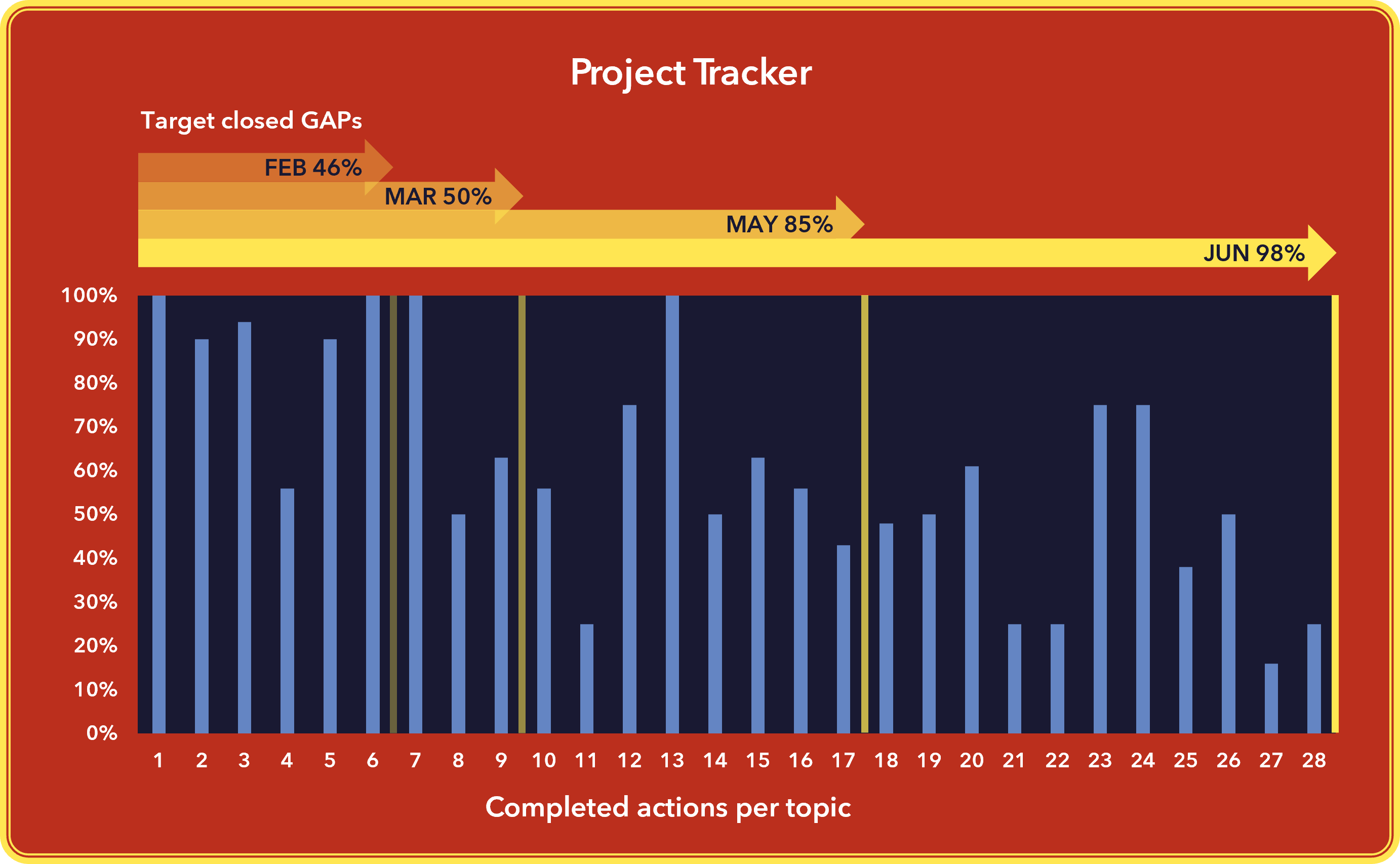 The gaps identified were divided into different topics, each with multiple action items. A large part of the actions had been completed by the planned end date, pending some that depend on third party agreements, which are expected to be closed out soon.