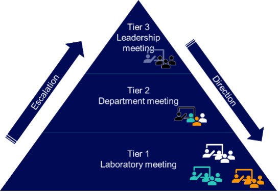 During the daily meetings in the three labs, the points of attention were discussed, such as overtime, safety and quality incidents, status of reports, equipment failures including downtime etc. Weekly, the collected data was reviewed to identify recurring issues and to determine whether to escalate the issue to a higher Tier level. Additionally, suggestions for improvements were discussed and initiated. Points of attention were reviewed monthly.